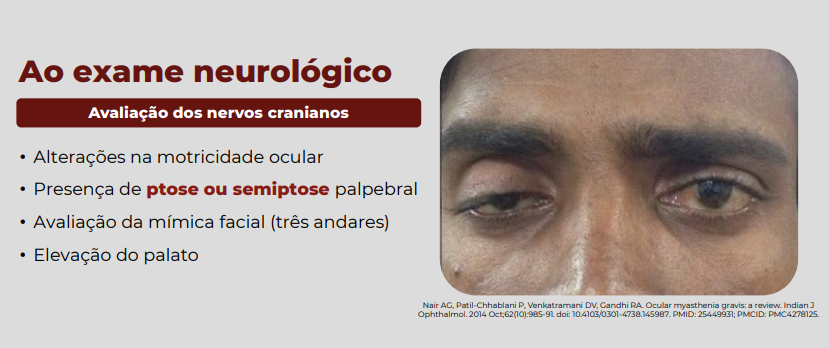 Manejo (Step 2): O diagnóstico é confirmado pela detecção de anticorpos anti-AChR ou pelo teste do gelo (ice pack test) positivo à beira do leito. O tratamento sintomático é feito com inibidores da acetilcolinesterase (ex: Piridostigmina). Investigar timoma (associado à MG) com TC de tórax é obrigatório.