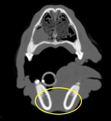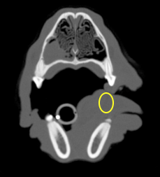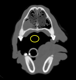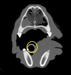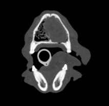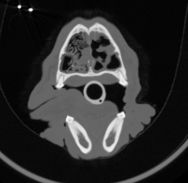 Freddie’s coagulation screen is unremarkable so he is anaesthetised for a CT of his nose to see what is up there. There are a variety of different appearances to the nose on CT depending on what the pathology shows. CT scans are made up of many slices, which we cannot replicate in this package.