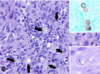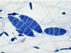 10–20 μm pigmented Medlar bodies with transverse and longitudinal septation