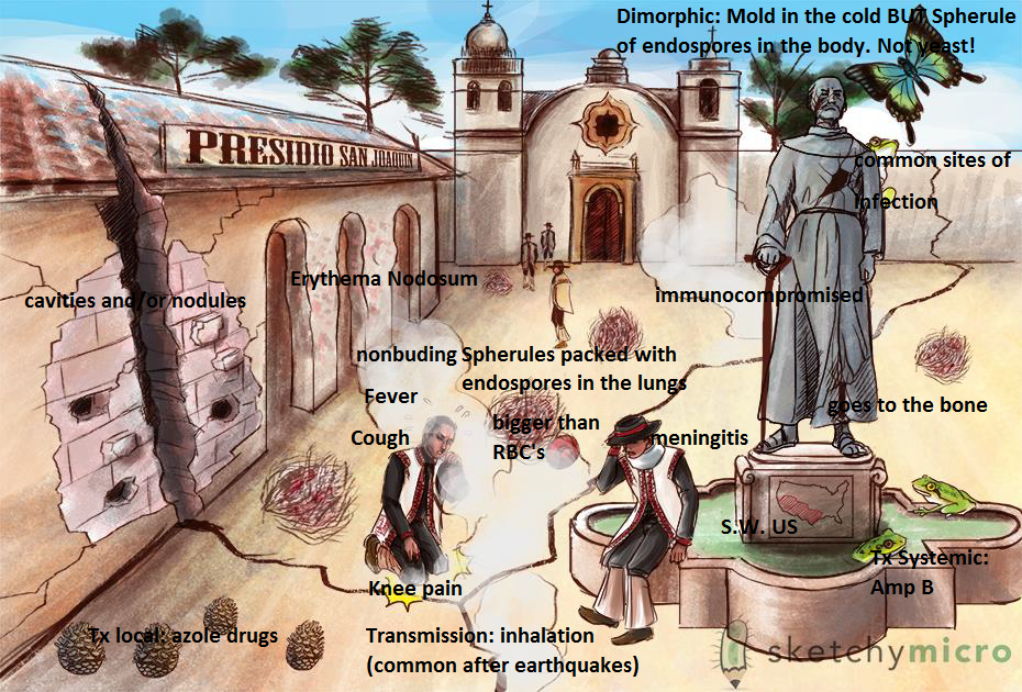 Dimorphic (mold in cold, spherule of endospore in the body! NOT yeast !)