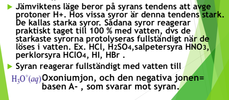 De är de starka syrorna som protolyseras fullständigt i vatten, deras baser är så ledes svaga