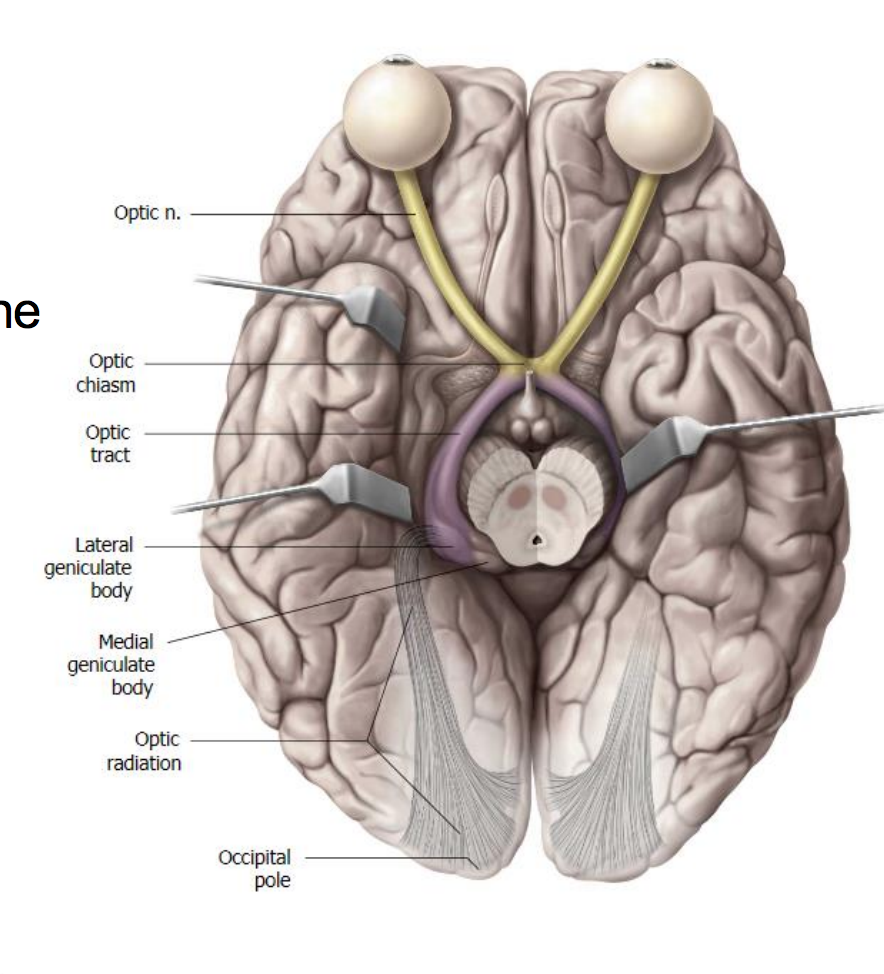 Ganglion cells in retina –> optic nerve –> exit orbit via optic canal –> middle cranial fossa –> lateral geniculate bodies of thalamus