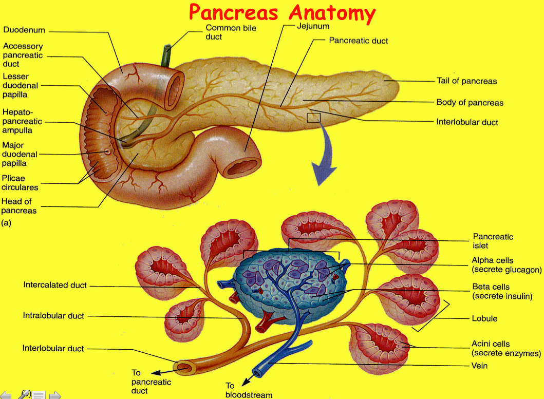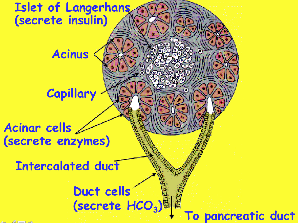 Islet cells produce insulin, glucagon and somatostatin (controls secretion of insulin and glucagon)