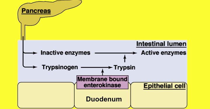 •Enterokinase (bound to brush border of duodenal enterocytes) converts trypsinogen to trypsin