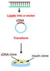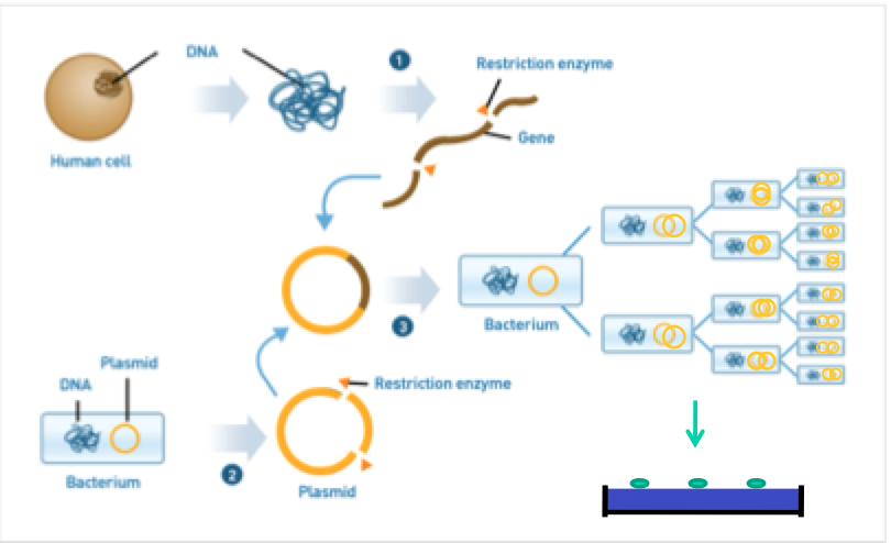 Chop DNA –> ligate it into the plasmid –> form recombinant DNA –> incorporate plasmid into bacteria host by transformation –> bacteria plated –> colonies containing desired genes can be identified and isolated.
