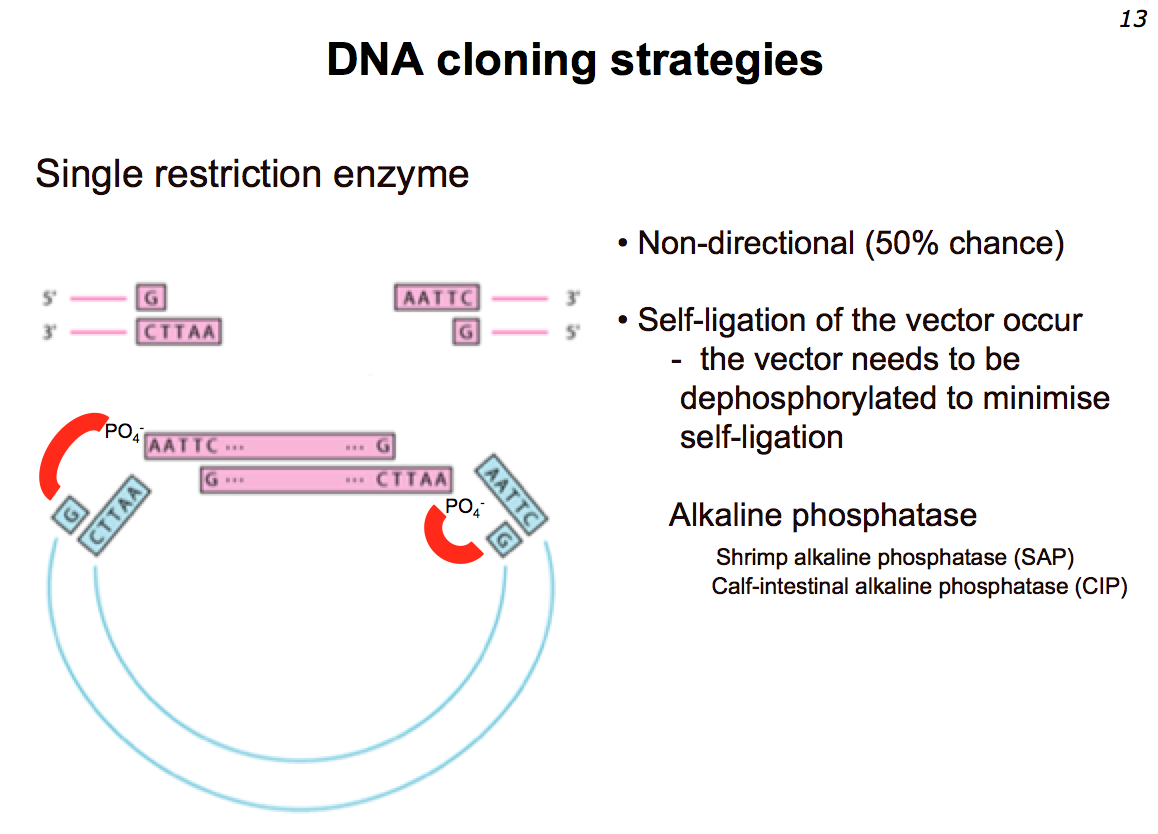 Another problem being self-ligation –> ends join back together –> prevented using alkaline phosphatase