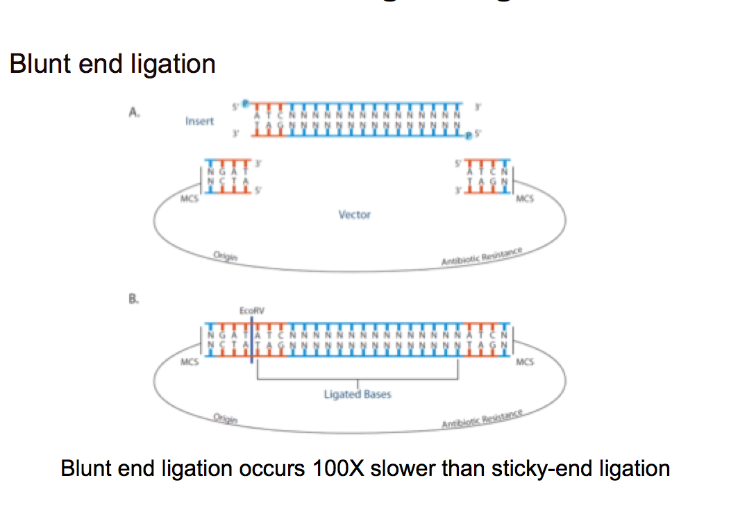 Blunt end/Straight end ligation –> hard to ligate –> no hydrogen bonds stabilizing the DNA