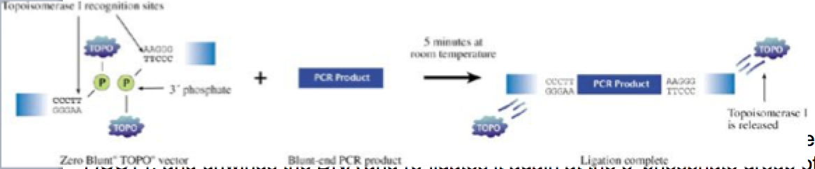 TOPO vectors carry (C/T)CCTT at the two linear ends. The linear vector DNA already has the topoisomerase enzyme covalently attached to both of its strands’ free 3’ ends.