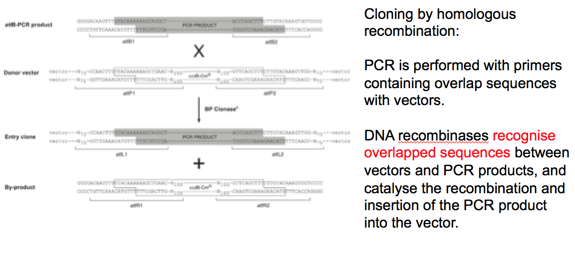 DNA recombinases recognise overlapped sequences between vectors and PCR products, and catalyse the recombination and insertion of the PCR product into the vector.