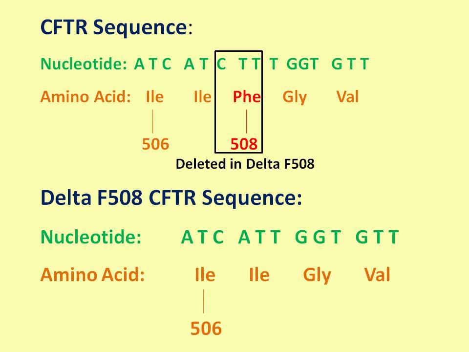Delta 508 - 3 base pair deletion (CTT coding for aa ‘Phe’) at position 508 of cftr gene