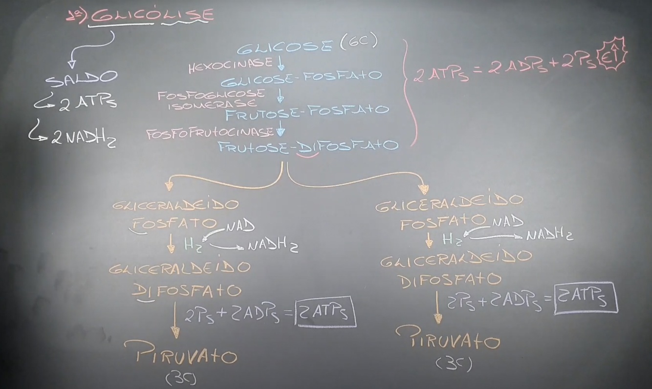 Eles liberam os dois fosfatos 2Ps esses se juntam com 2 ADPs formando 2ATPS. Por fim o piruvato é produzido (3 moléculas de carbono cada )