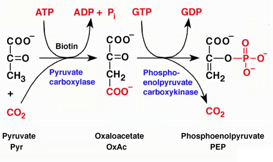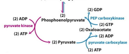 two new enzymes: pyruvate carboxylase converts pyruvate to oxaloacetate, PEP carboxykinase converts oxaloacetate to phosphoenolpyruvate