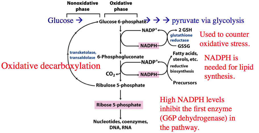 Nonoxidative phase recycles six molecules of the pentose into five molecules of the hexose glucose 6-phosphate, allowing continued production of NADPH and converting glucose 6-phosphate to CO2.