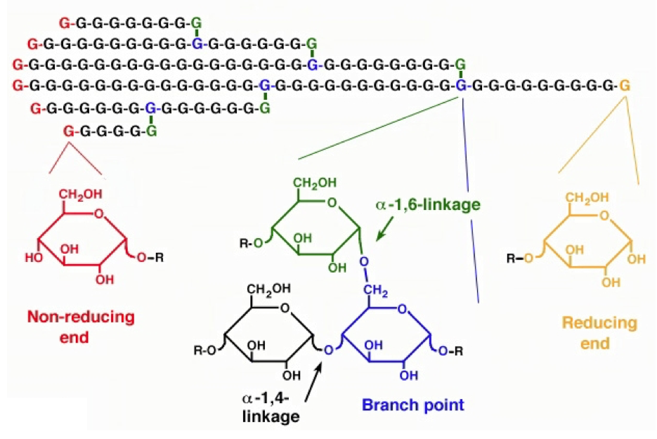 What is the ratio of α1-4 glycosidic linkages to α1-6 glycosidic linkages in glycogen?
