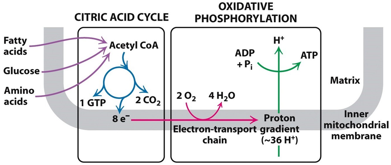 Where does the citric acid cycle and oxidative phosphorylation occur?
