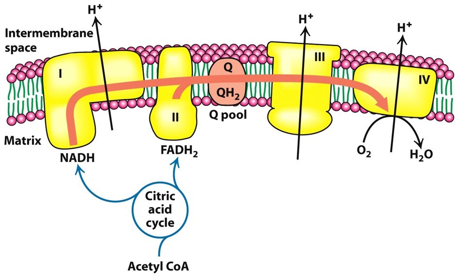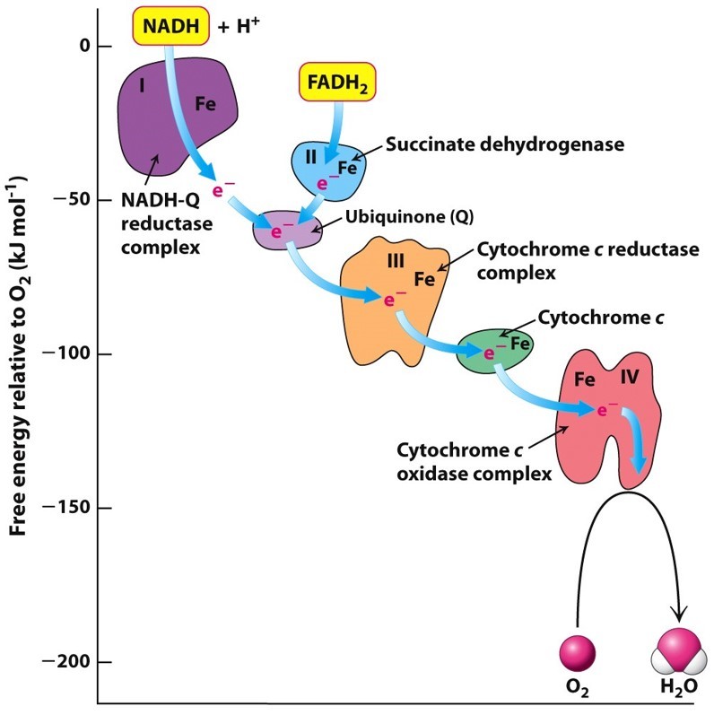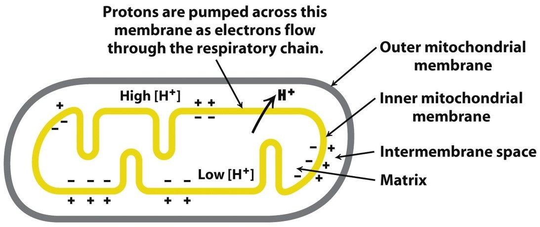 As electrons are relayed through the electron transport chain, the free energy released is used to pump protons (H+) into the mitochondrial intermembrane space (against the concentration gradient