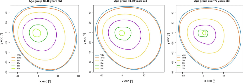 contours of visual sensitivity (‘a contour line in a representation of the visual field around the points representing the macula that passes through the points of equal visual acuity’)