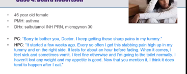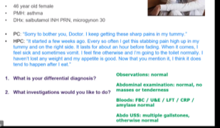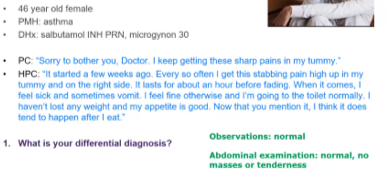 Most likely is biliary colic – worse after eating, last 1hr, sick and vomiting