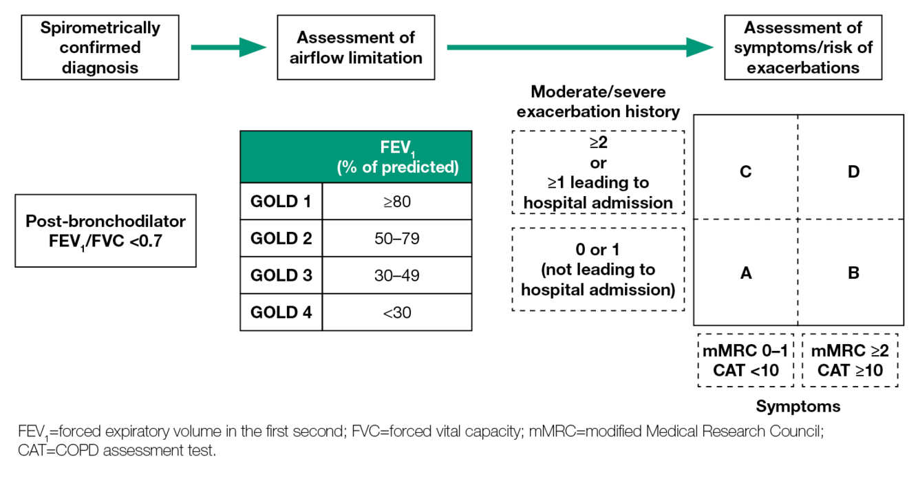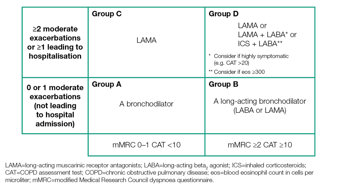 Letters: (groups A to D) provides information regarding symptom burden and risk of exacerbation which can be used to guide therapy