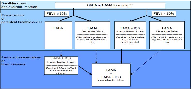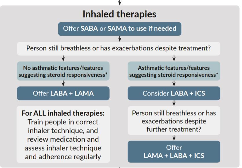 NICE only recommends theophylline in COPD after trials of short & long-acting bronchodilators or to people who cannot used inhaled therapy
