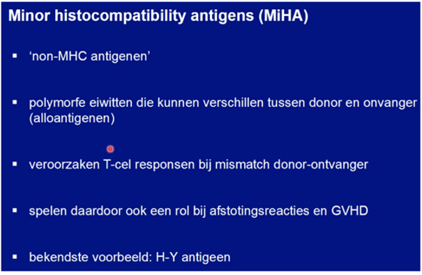 Dus ook in een volledig HLA gematchte setting waarin donor en ontvanger hetzelfde HLA hebben kan je nog steeds afstotingsreacties krijgen door MiHA. Maar voordeel: anders ook geen anti-ziekte reactie