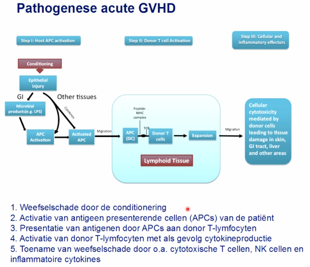 GVHD veroorzaakt door T-lymfo’s (vooral CD4+ Th) en NK-cellen, Tk cellen en APC
