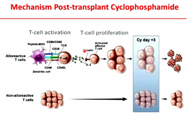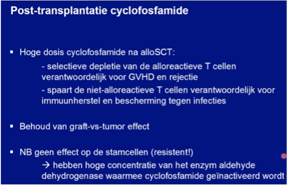 Cyclofosfamide: chemo: heel sterk immuun-onderdrukkende eigenschappen: geef op 3e en 4e dag na transplantaatinfusie–> stopt snelle deling allo-reactieve T-cellen vroeg na transplantatie en laat de non-alloreactieve T-cellen lekker met rust