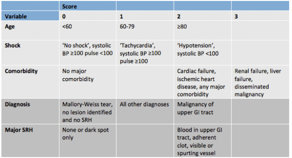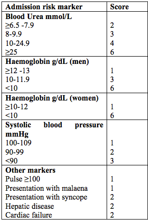 A score of 3 or less is associated with a rebleeding rate of 4% and a very low risk of mortality and identifies a group of patients suitable for early discharge.