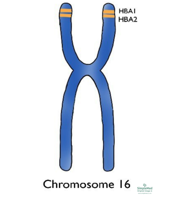 α-thalassaemias are caused by mutations (usually deletions) in the HBA1 and/or HBA2 genes on chromosome 16. The increased deletion of α chains means there are an excess of β chains in adults, and γ chains in foetuses. This means the patient is unable to form the normal globular proteins in the pattern of 2α and 2 other. The relative excess of these other chains leads to defective red cells, which are destroyed in large numbers by the spleen – this causes haemolytic anaemia.