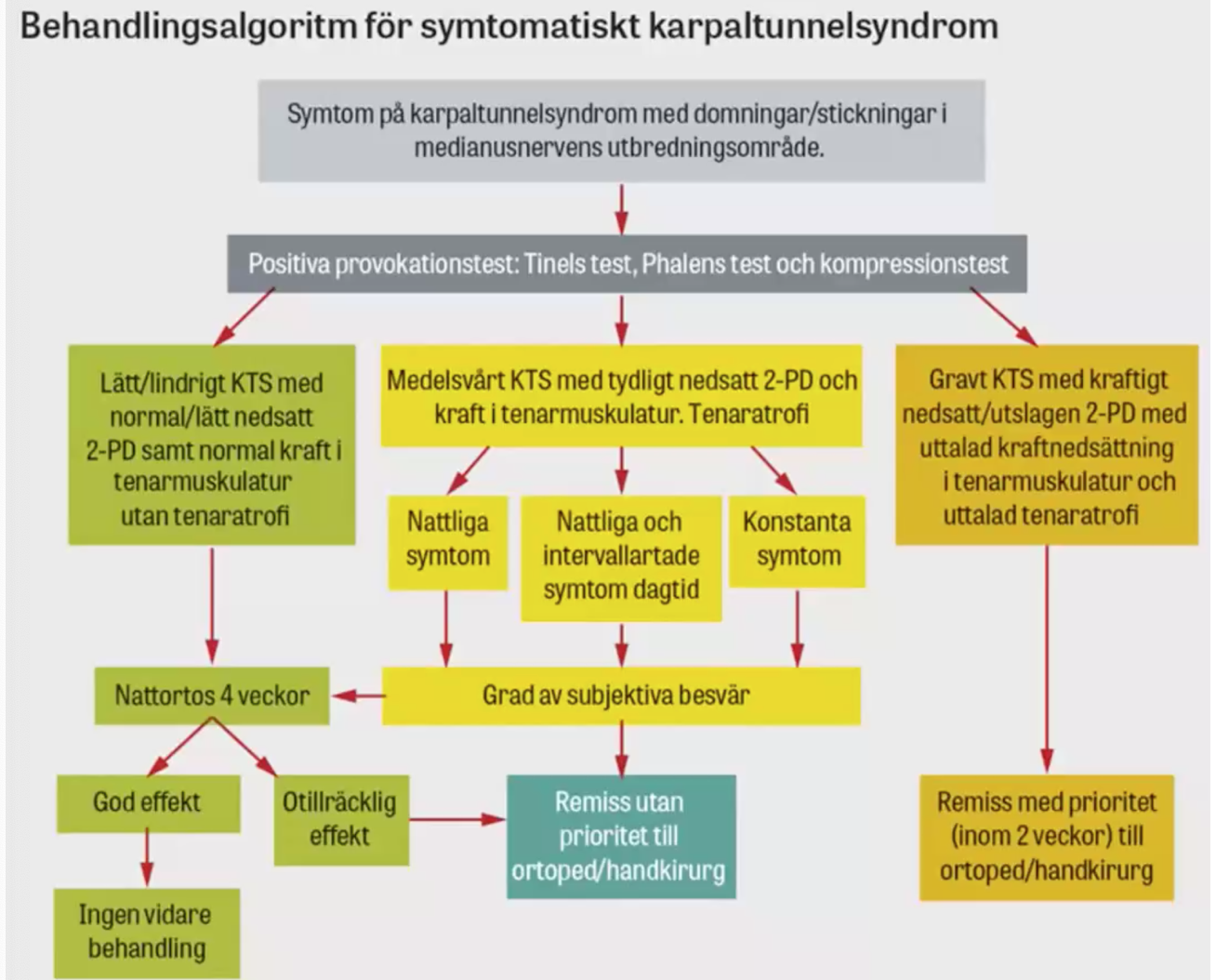 è Operation med klyvning av karpalligamentet inom 1 vecka, annars risk för bestående nervpåverkan.