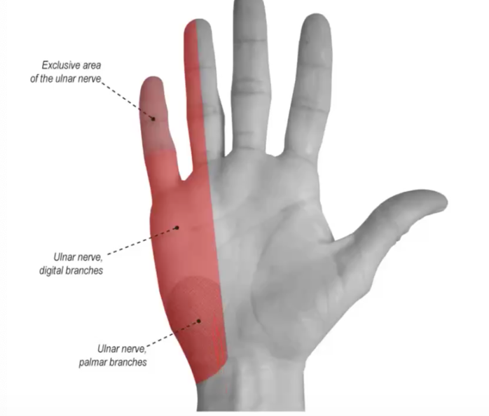 Domningar i dig 4-5. Men även känselbortfall, muskelatrofi och fumlighet i dessa fingrar.