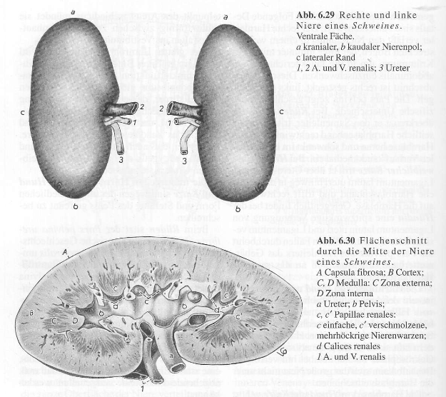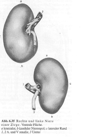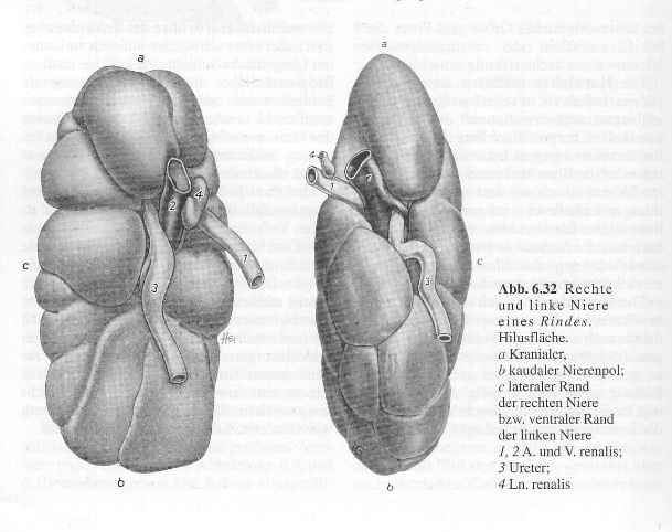 durch die raumfüllende Ausdehnung des Pansens wird die linke Niere auf die rechte Seite der Bauchhöhle verlagert; dort ist die linke Niere weiterhin retroperitoneal gelegen, kaudal der rechten Niere fixiert