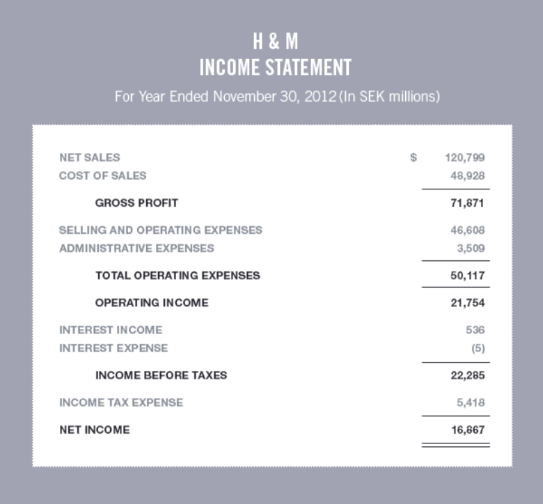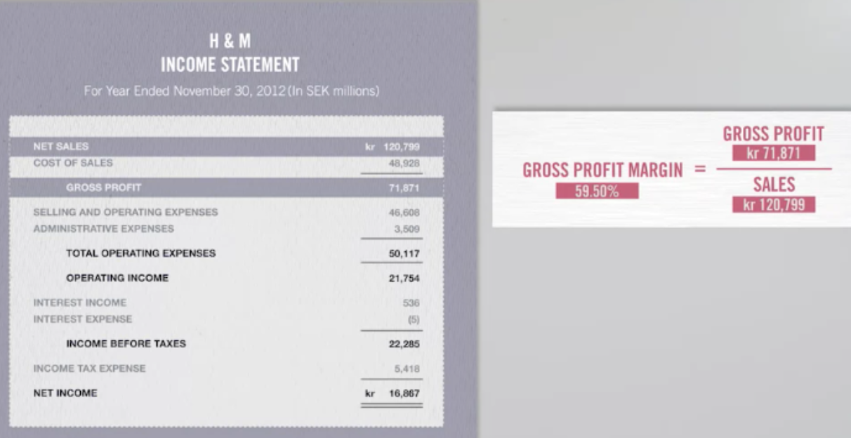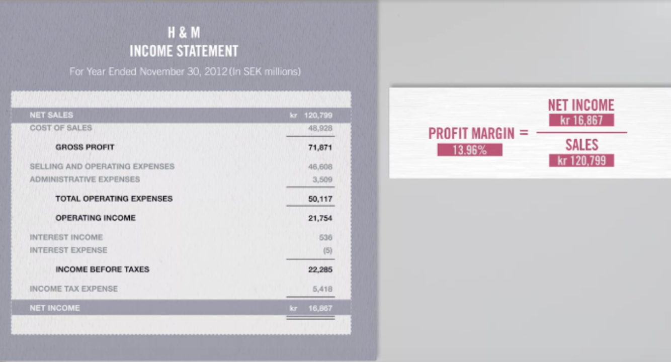 For H&M in the year 2012, the profit margin was 13.96%. In other words, for every hundred Swedish krona of sales that H&M had, 14 ended up in the net income for the period. Profit margin is an important measure.
