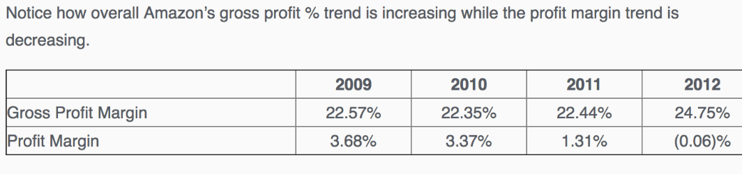 The gross profit margin for Amazon for each year from 2010 to 2012 is listed below.