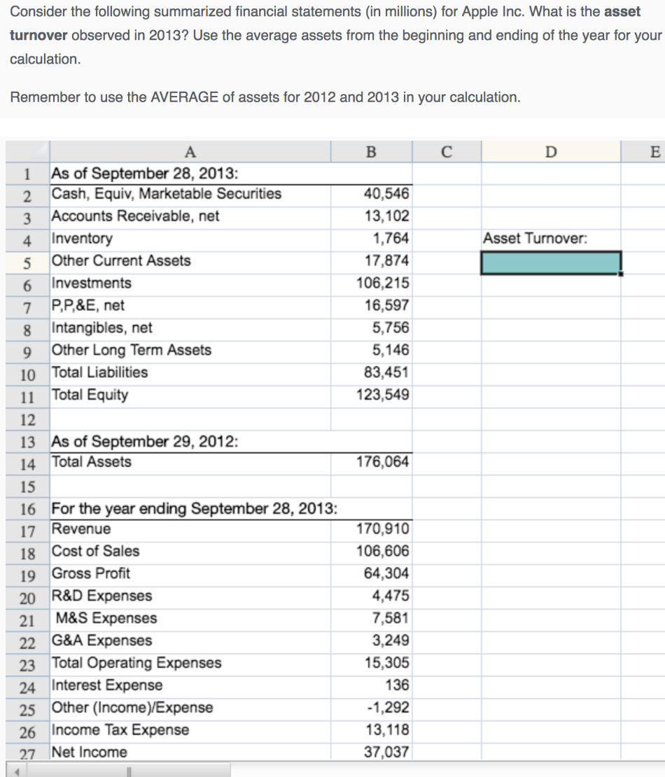 To calculate average assets, you are given the beginning total of $176,064 but you must calculate the ending total by summing all asset accounts as of Sept 28, 2013 (a shortcut would be to add the Liabilities and Equity at September 28, 2013, since we know A = L + OE). The ending total is $207,000 making the average $191,532.