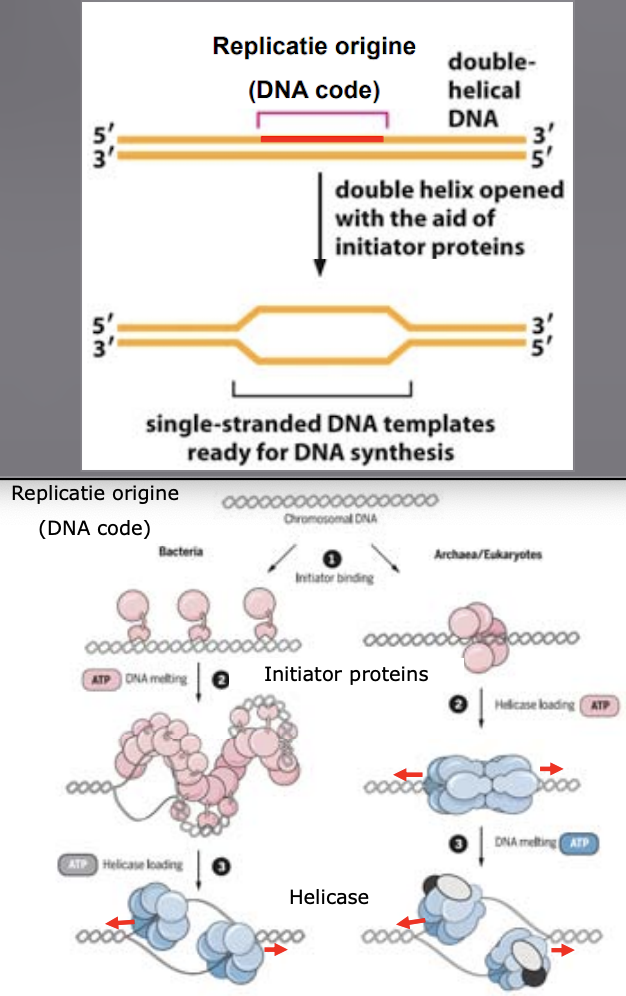 Met de opening van DNA bij de replicatie origine, met behulp van initiatoren (helicase)