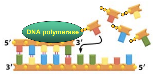 DNA polymerase maakt de covalente binding in DNA, polymeriseert alle nucleotiden, en loopt zo de oude streng af om nieuwe nucleotiden te verbinden.