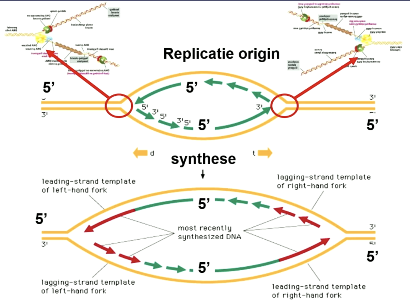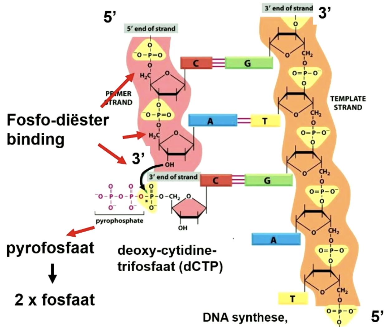 DNA polymerase loopt de template streng af van 3’ naar 5’, maar maakt een 5’ tot 3’ streng (dus de richting is 5’ naar 3’)