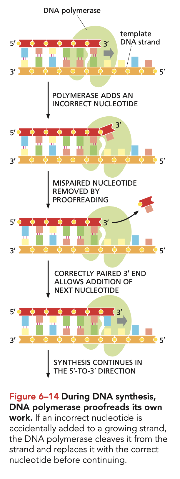 Door de proofreading activiteit van DNA polymerase worden foute basen direct verwijderd na de inbouw
