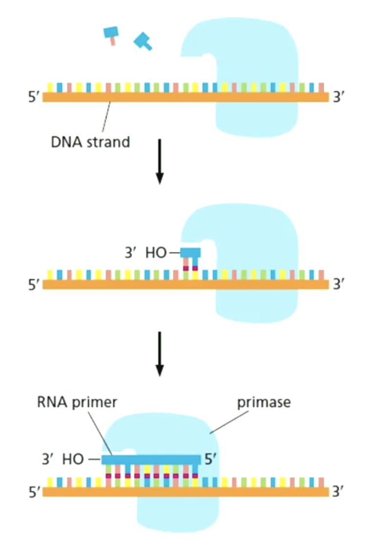 DNA polymerase kan de primer (beginstuk met vrije 3’ OH groep) niet zelf maken, en dus maakt primase een beginnetje van RNA voor DNA polymerase. Primase is dus de startmotor.