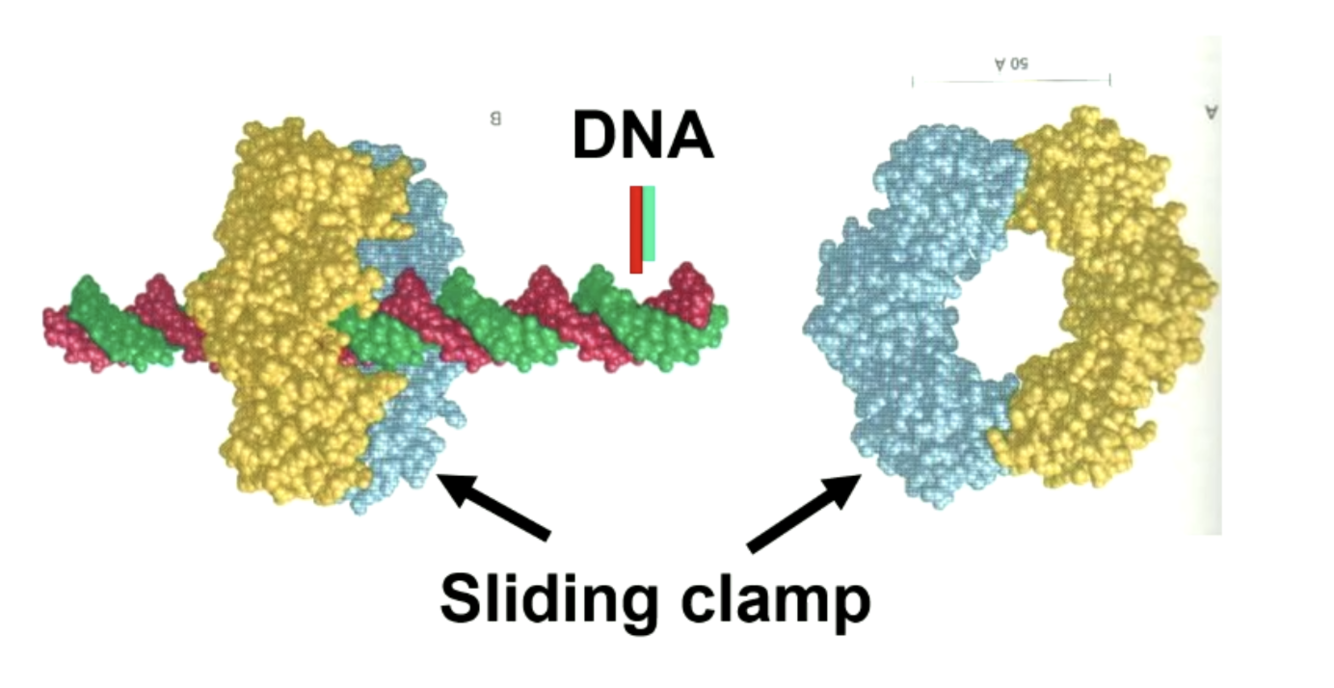 Door een sliding clamp. Dit zorgt ervoor dat DNA polymerase met een behoorlijke snelheid langs het DNA kan gaan zonder het DNA los te laten