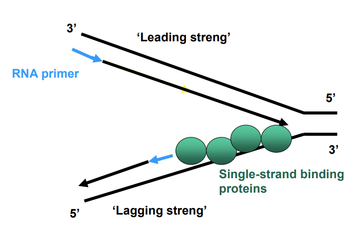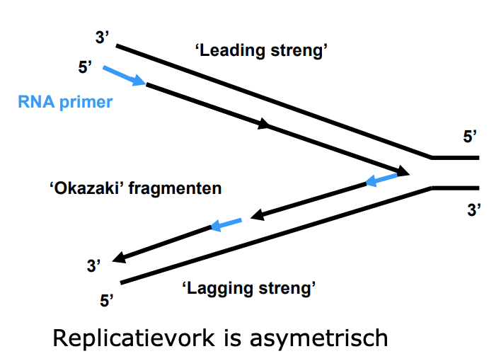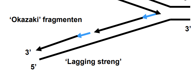 Bij de leading streng gaat de replicatie in de goede richting (van 5’ naar 3’), en bij de lagging streng gaat het in de verkeerde richting (van 3’ naar 5’) waardoor je steeds kleine stukjes krijgt i.p.v. dat het doorloopt.