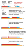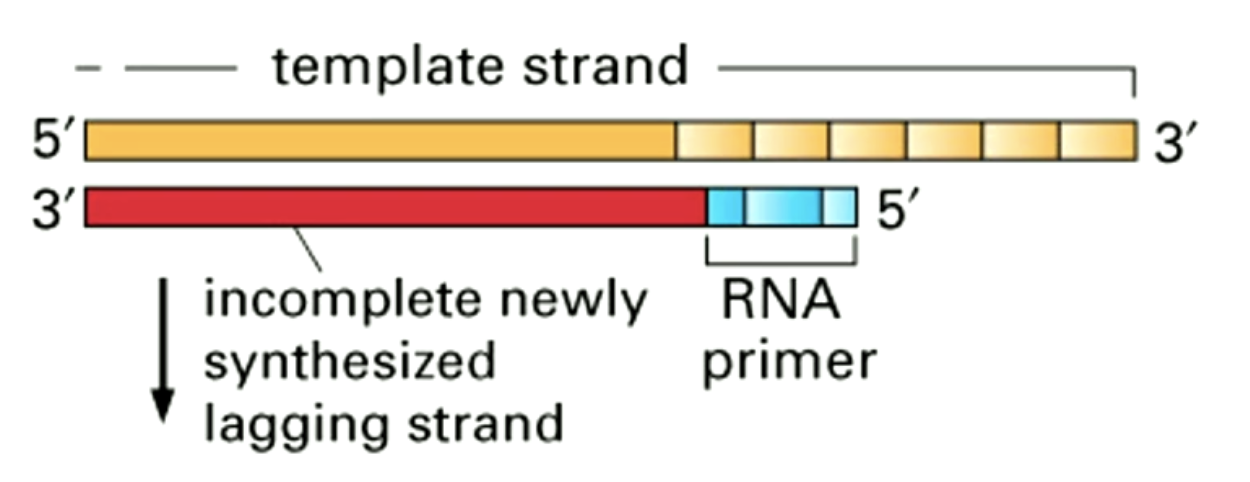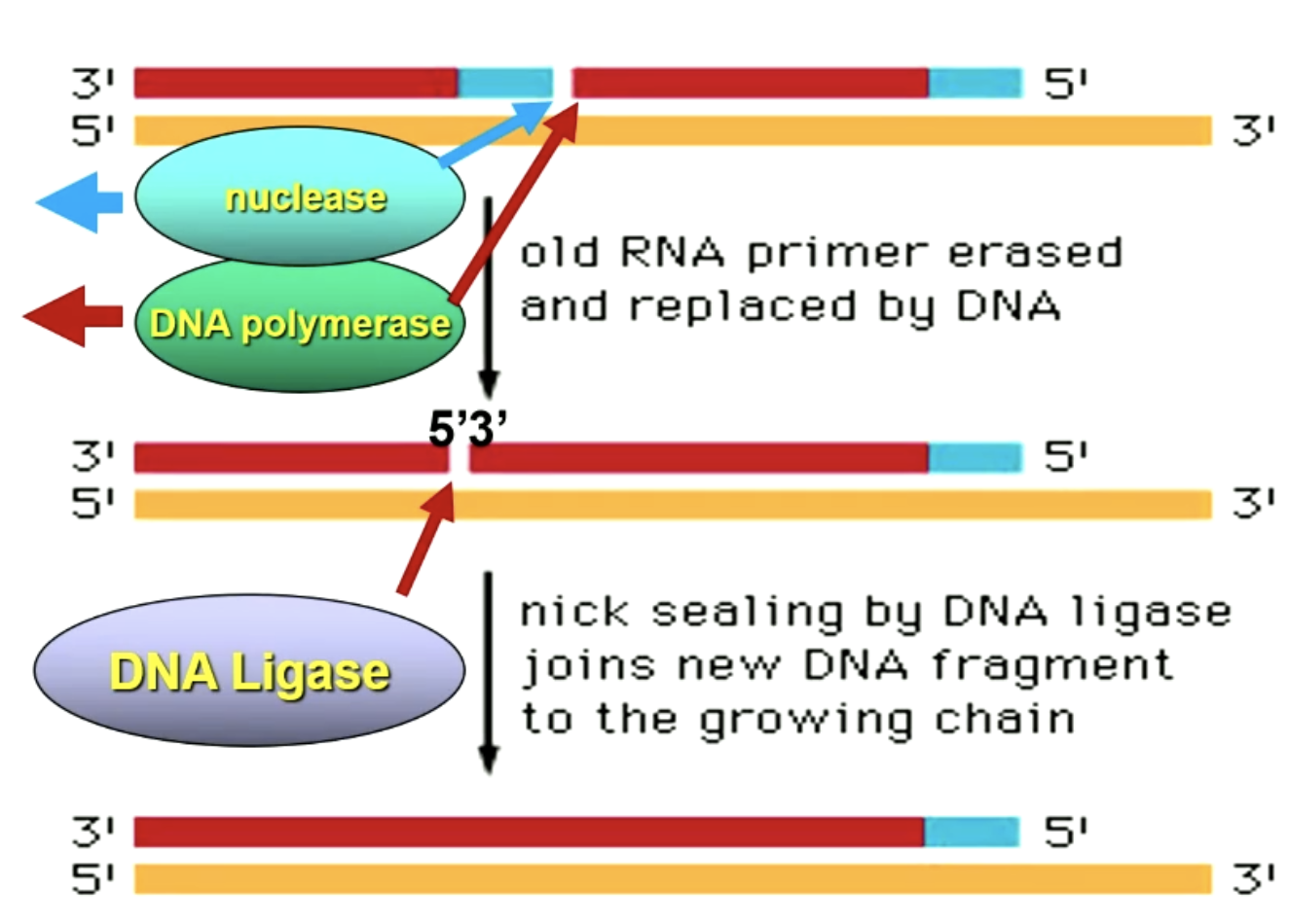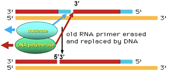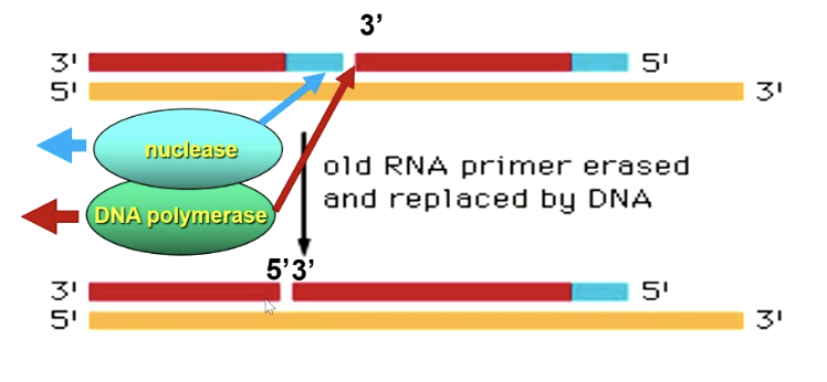 Nuclease breekt de RNA primer af, waarna DNA polymerase van 3’ tot 5’ DNA inbouwt.