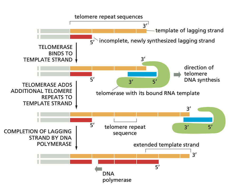 Telomerase plakt een extra herhaling aan de template strand, waardoor DNA polymerase de net gesynthetiseerde lagging strand kan verlengen