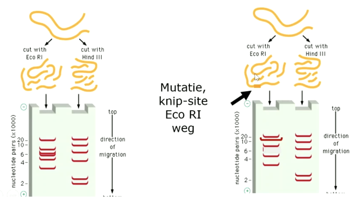 Om lange stukken DNA in specifieke fragmenten te knippen. Het fragmentatie patroon is karakteristiek voor een stuk DNA en dus kun je mutaties herkennen in een stuk DNA als het enzym niet knipt op een plek waar het normaal wel knipt. Je krijgt dan een ander patroon op de gel.