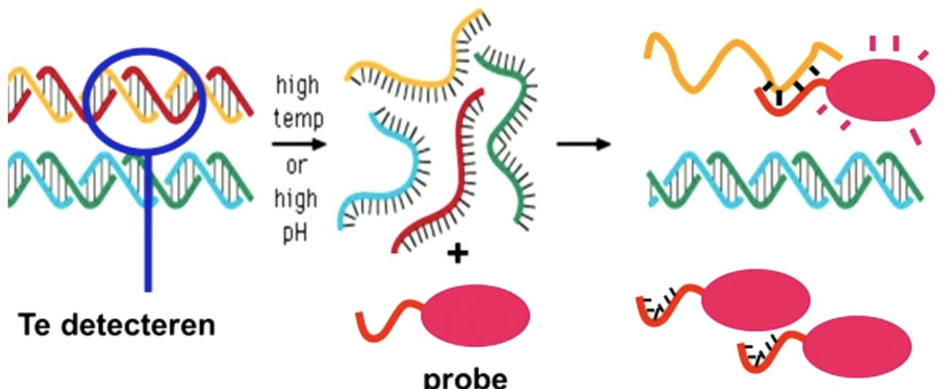 Voor het detecteren van een specifiek DNA of RNA fragment. M.b.v. een probe (stukje enkelstrengs DNA dat omgekeerd complementair is aan het te onderzoeken stuk DNA of RNA, en die makkelijk gedetecteerd kan worden (bijv. door fluorescentie label) die je kunt binden aan het complementaire stuk DNA