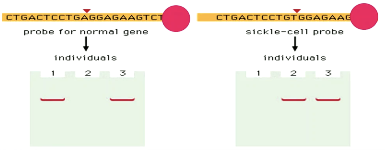 Hier zijn twee verschillende probes (1 voor het gezonde gen, en 1 voor het gemuteerde gen) teogevoegd aan twee buisjes met enkelstrengs DNA. Wat kun je zeggen over de drie individuen m.b.t. sickle cel anemie?