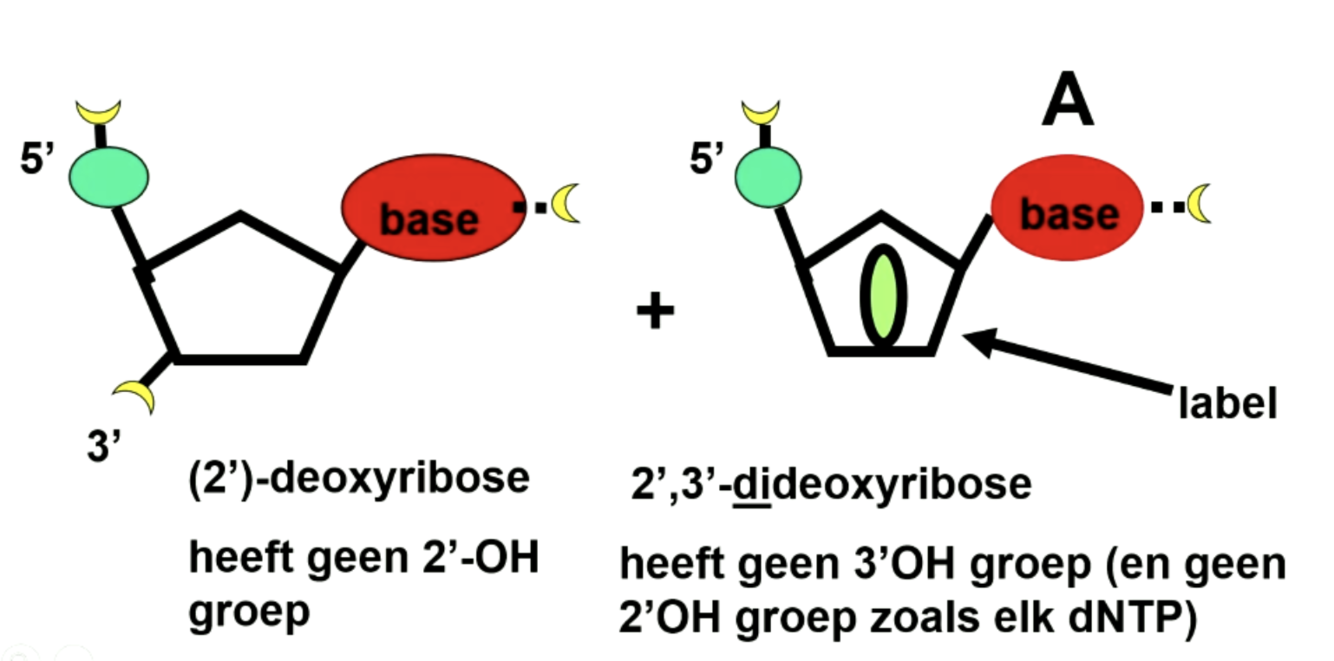 De laatste base is een fluorescente dideoxy base. Deze heeft geen 3’ OH groep dus kan er geen volgende nucleotide aan binden.