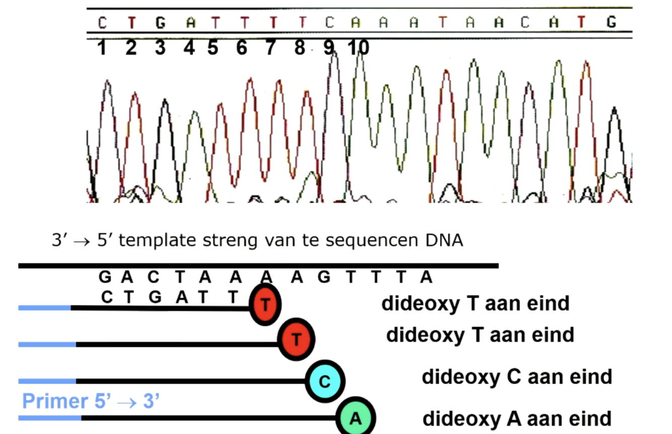 DNA wordt heel erg vaak gerepliceerd, waar er op elke verschillende lengte wel een keer een fluoriserende dideoxy nucleotide wordt ingebouwd. Als deze is ingebouwd stopt de keten. Je krijgt dus een hele hoop fragmenten waaruit je de volgorde van de base kan halen d.m.v. grootte scheiding (met een gel). Je kunt dan de fragmenten op lengte verdelen, zoals bijv. 10 basen, en als hij dan groen is, is de laatste base een A.