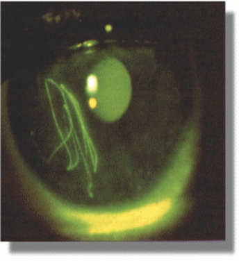 * Grab flourescent stip and moist it with steril saline or a topical anethtic
